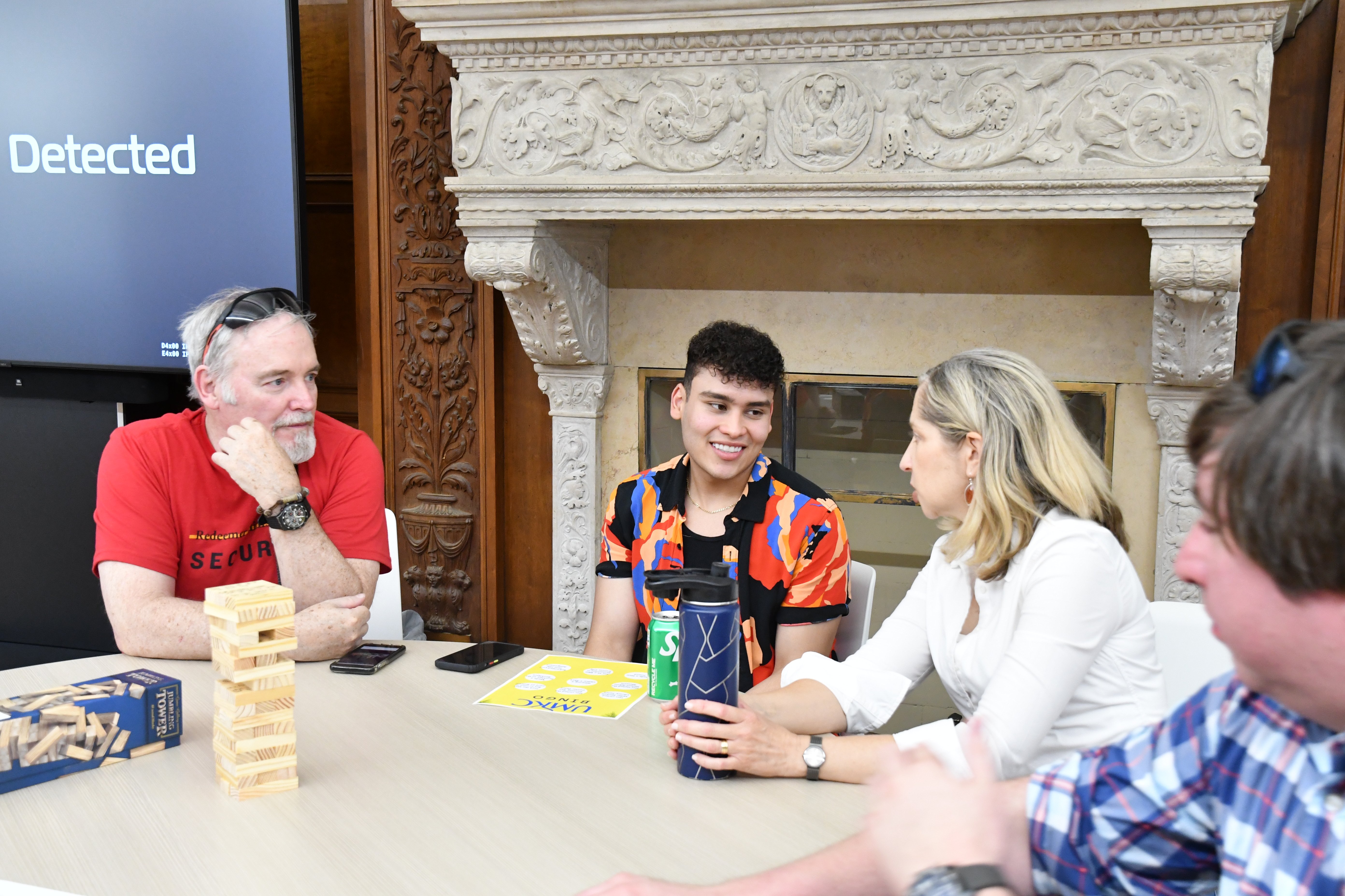 After two students tied for Bingo, everyone separated into three different groups for games like Conversation Jenga, Slapzi, and On the Dot, a brainteaser that requires both creative and analytical thinking. Students and faculty at this table frequently sported scrunched foreheads and puzzled looks. Meanwhile Slapzi required quick-thinking skills and even quicker reflexes. After a player drew a card with a description from the deck, students would race to slap down a card that matched that description. Far-reaching laughter could be heard when someone slapped down a card suggesting that garden saws are mostly used for safety, or that a camel can be carried in a back pocket. While it sometimes appeared that the game was partially a “luck of the draw” sort of situation, this didn’t stop one student from accumulating a three-time winning streak. She claimed she didn’t have a secret strategy but not everyone was convinced.