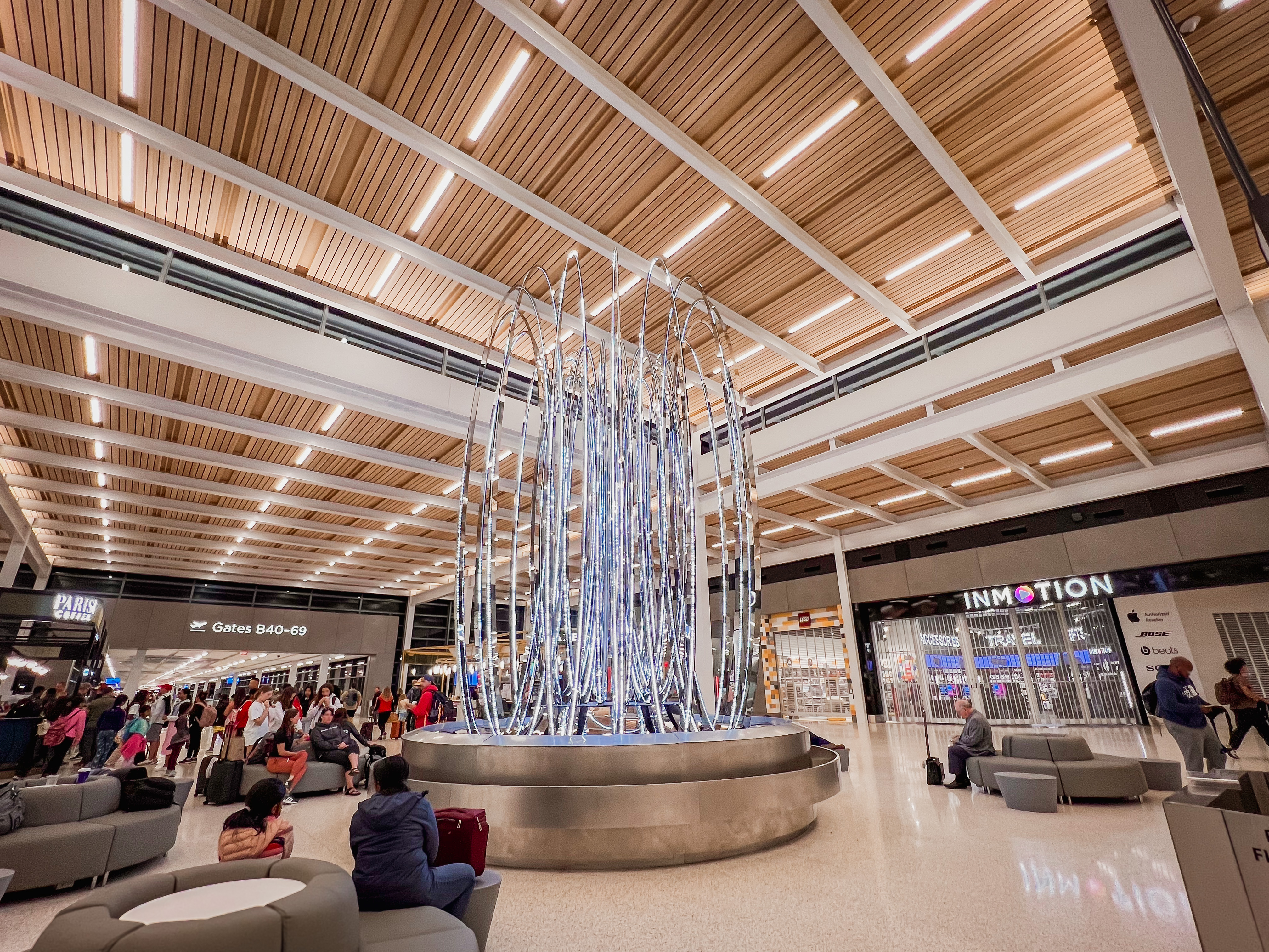 The new KCI airport is also littered with subtle but beautiful references to its former self, and the culture of Kansas City. One of the biggest Kansas City cultural references you will encounter is this sparkling statue, created in ode to the “City of Fountains,” which Kansas City is also known as.