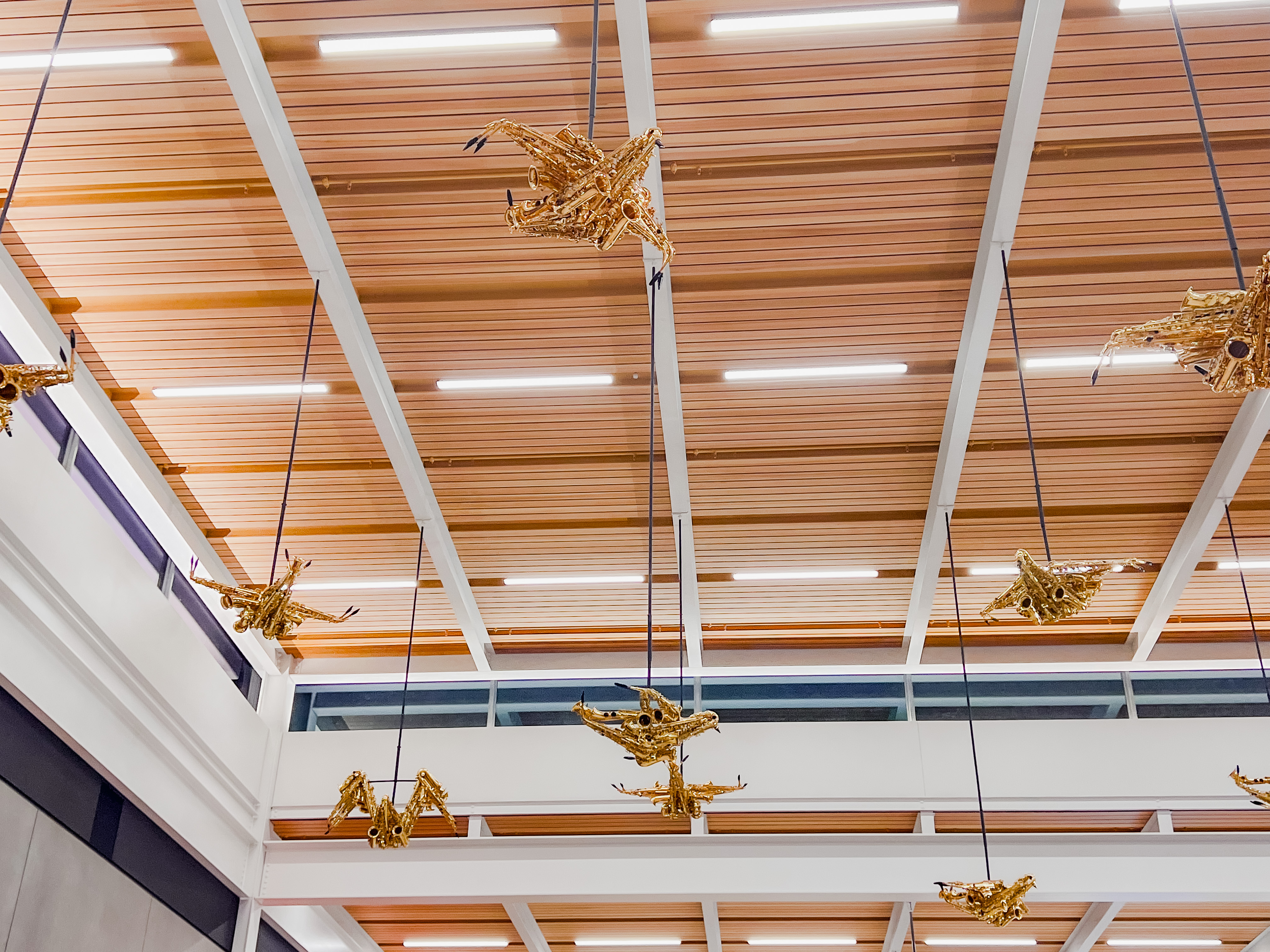 Further in the terminal, in concourse B, you will find these suspended pieces constructed from alto saxophones.