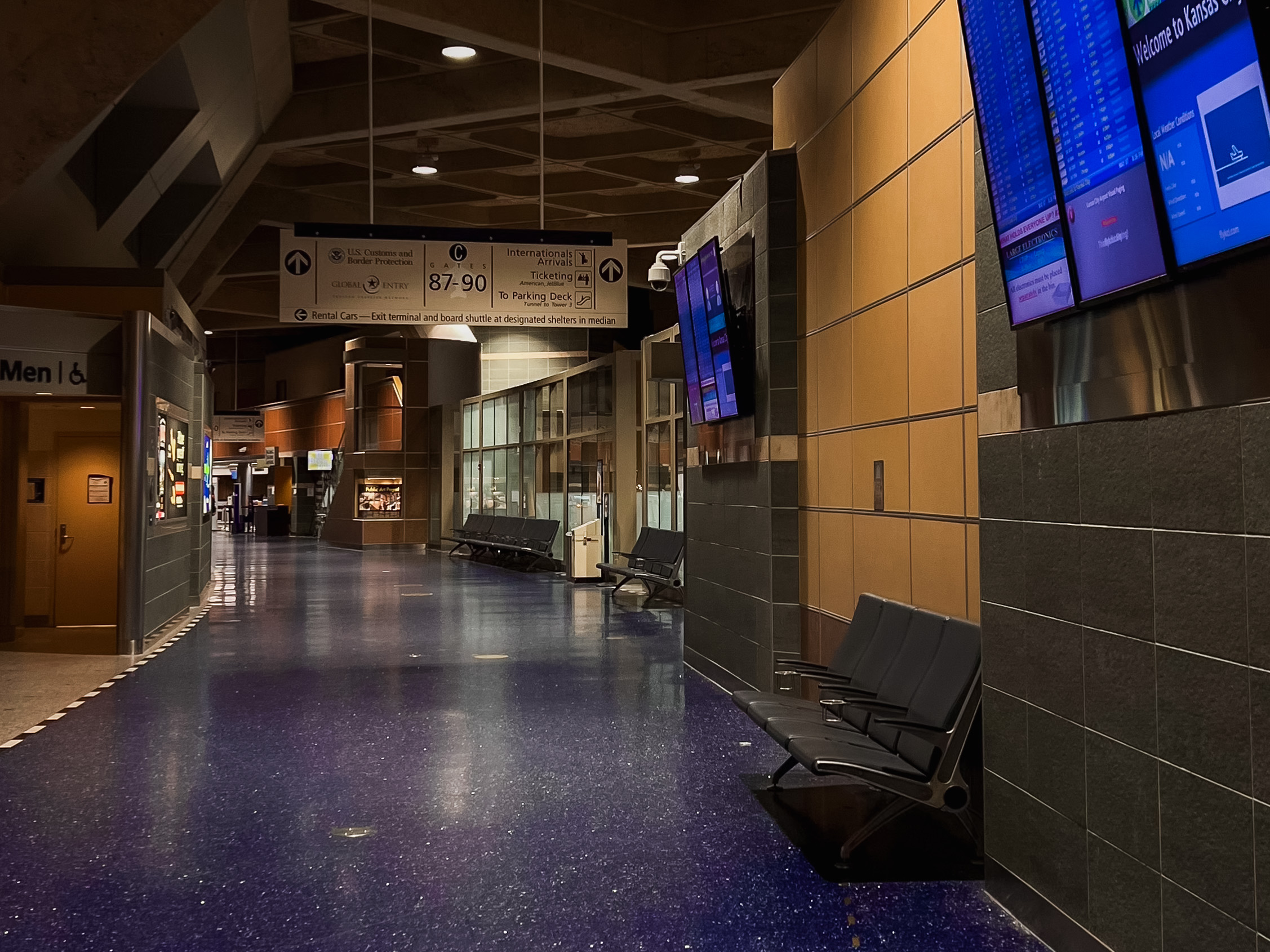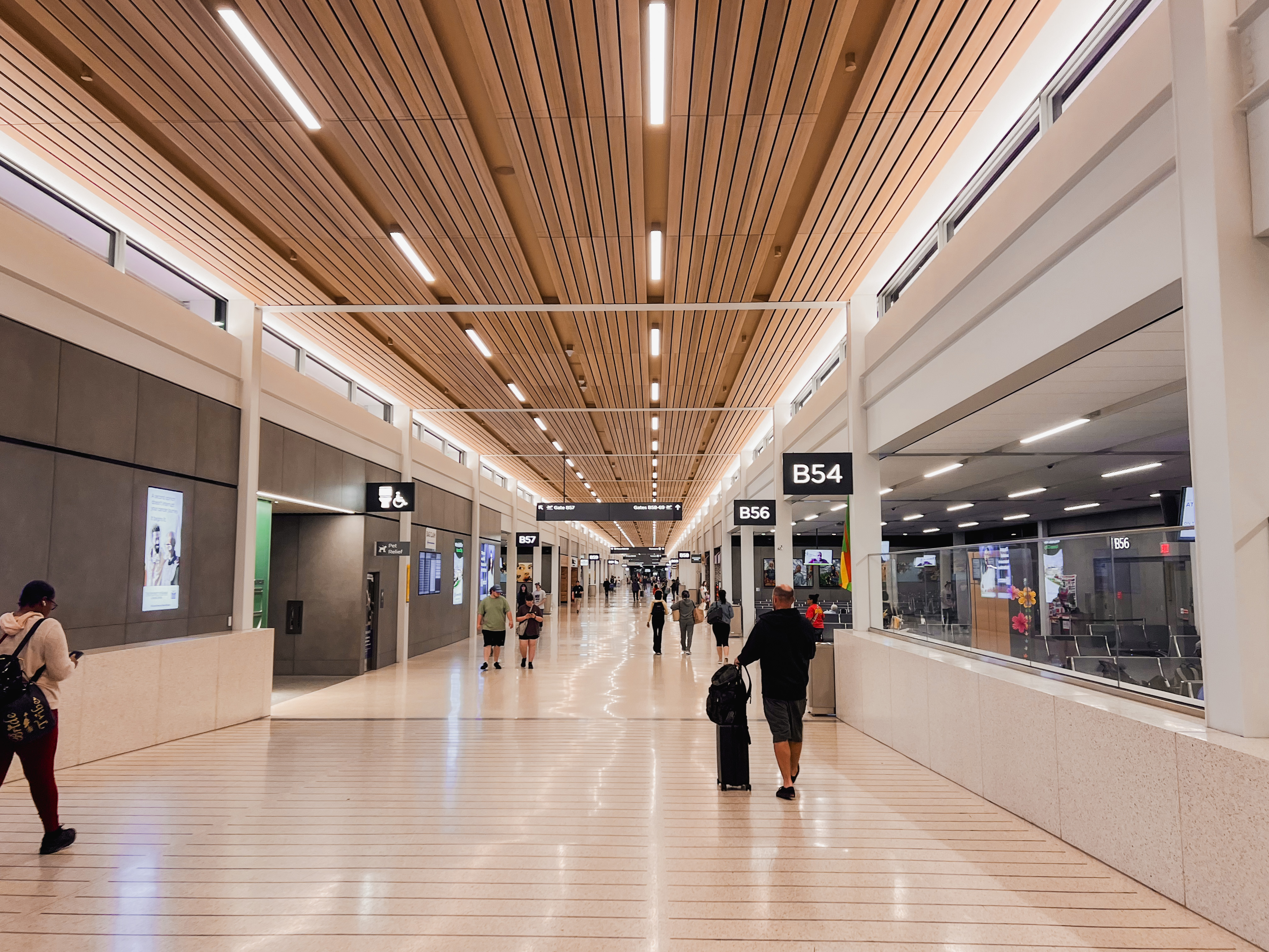 This new airport reflects a modern, sleek airport design consisting of a single terminal with two concourses. The new KCI features many glass windows, inviting warmth and light into the terminal, as well as high ceilings that create airy and open spaces. The airport features beautiful glass jet bridges, large boarding areas, a pet-relief area, nursing rooms, and a children’s play area. In addition, the new airport values inclusivity, featuring all-gender restrooms, family restrooms, a quiet room, sensory room, and many other features.