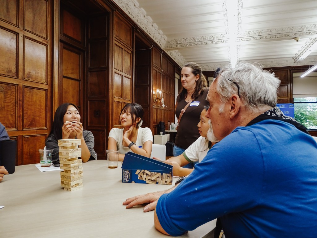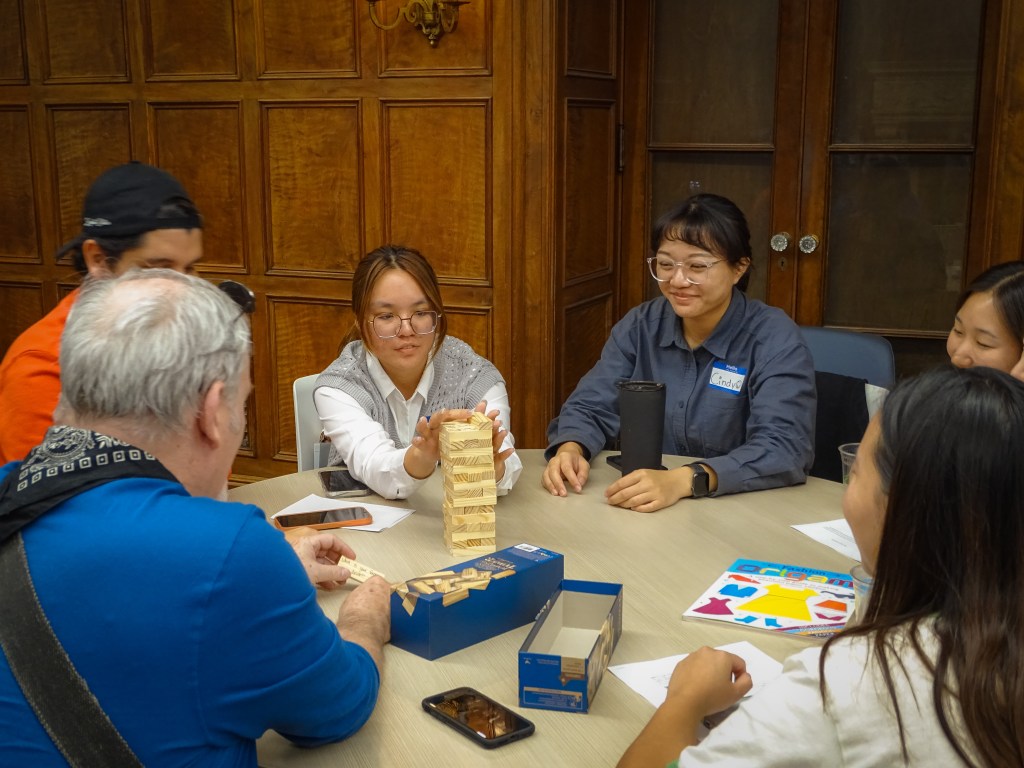 After reviewing the important details of the semester, everyone in attendance broke into two tables for games. One table played a game of Jenga, and the blocks were marked with icebreaker questions. This helped everyone get to know each other. It was thrilling to see how some players tested the balance of the Jenga tower with risky pulls, and others were gentle and careful with their block pulls.