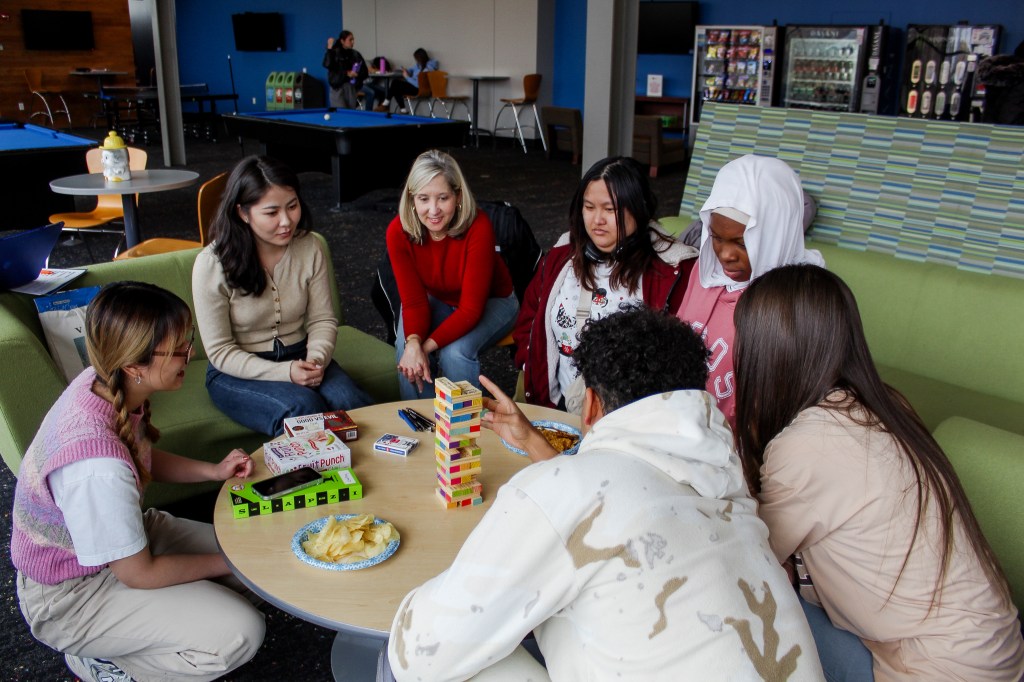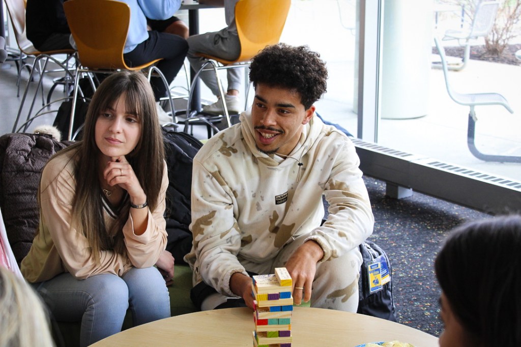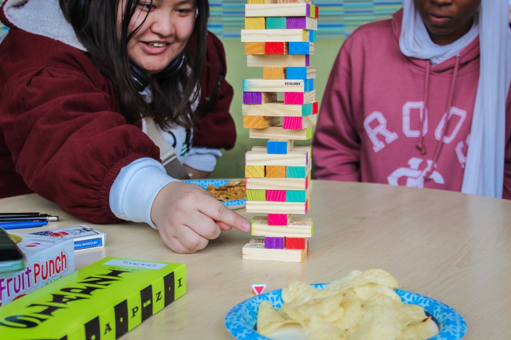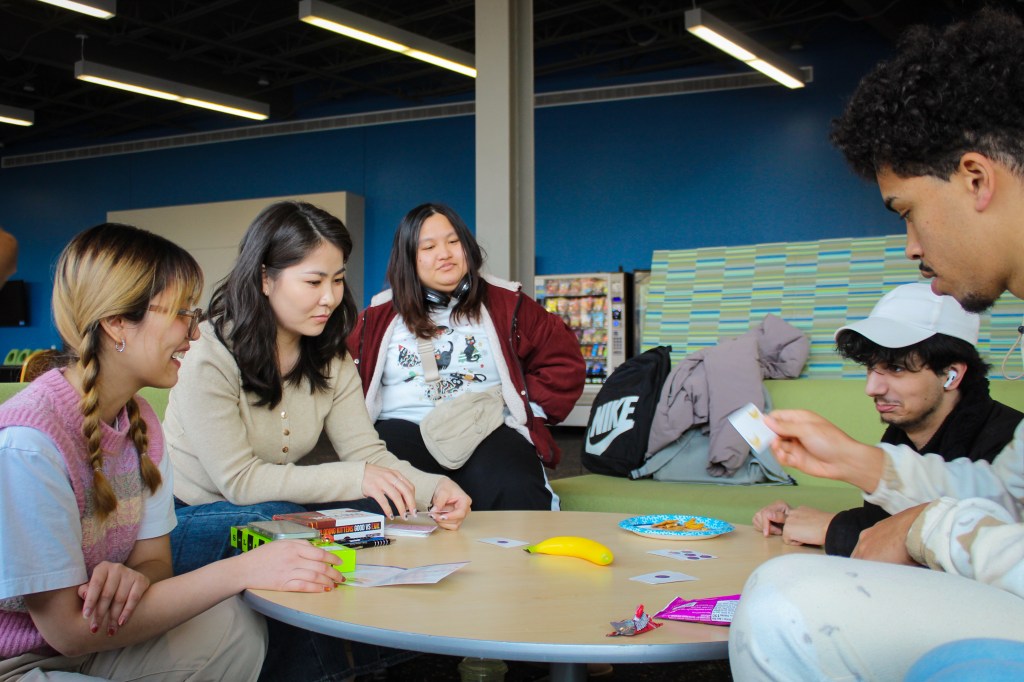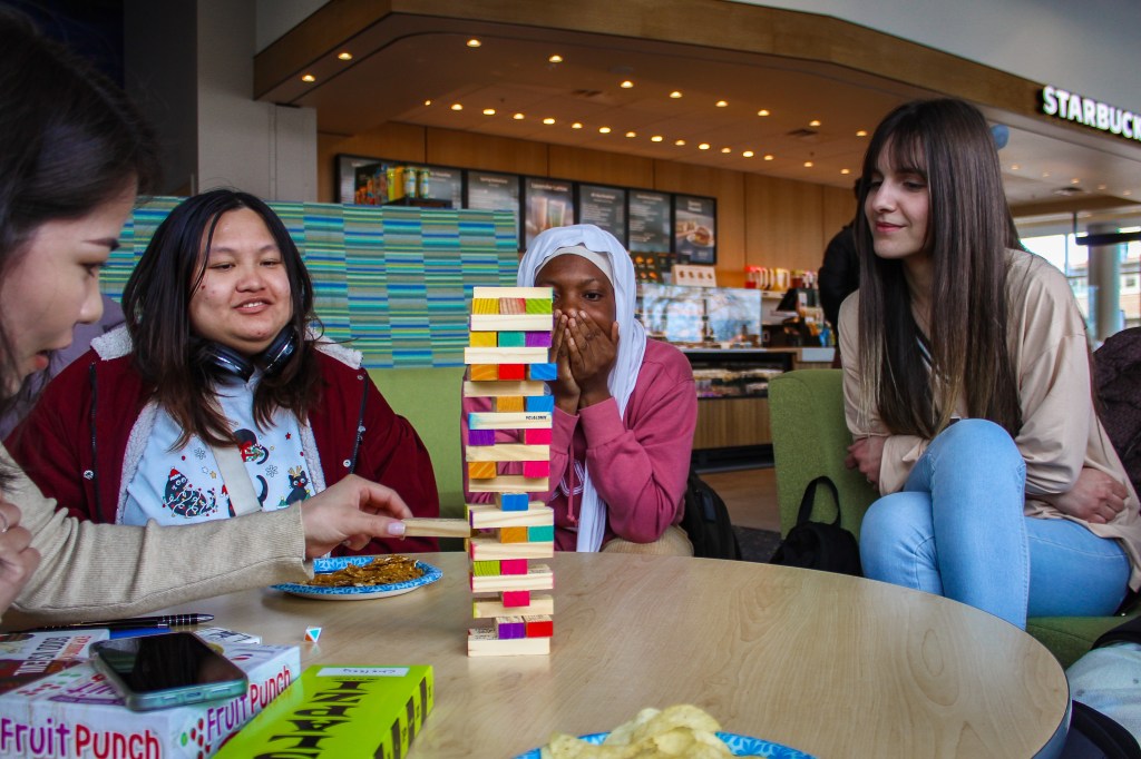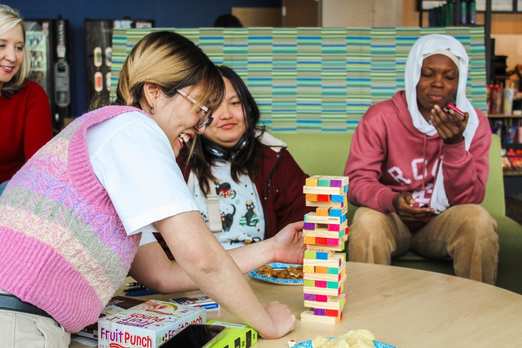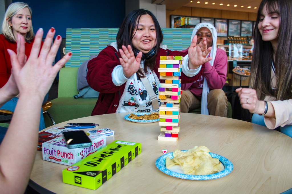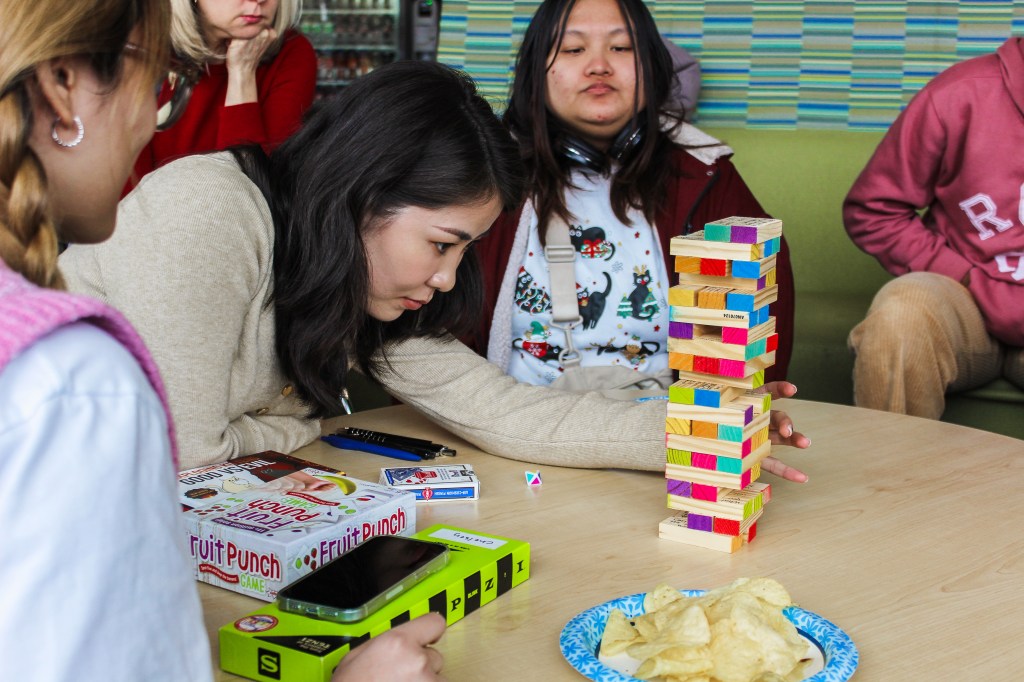 What better way to kick off the month than having a game night in the Student Union? On the first Thursday of March, ALI students got a chance to show off their expertise in games like Tumbling Tower, Fruit Punch, and Uno. We were a competitive bunch, so there were some tense moments when a player pulled out a risky block, or when two players raced to slap the Fruit Punch banana. Yet, the space was lively because after every win and loss, the group would lean back and burst into hysterics.