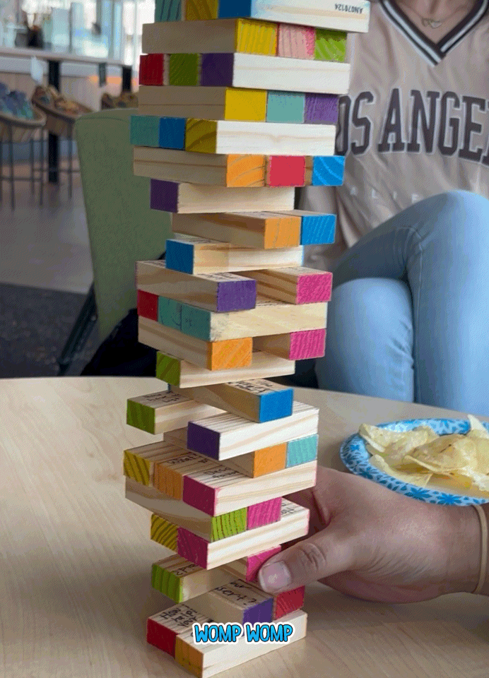 We customized the original Tumbling Tower game to make it more engaging. Each wooden block pulled out consisted of one question, and students would have a chance to either answer it, or pass it to someone else. After a few rounds, we now know our students’ spirit animals, favorite emojis, and travel aspirations!